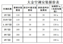 下面是大金空調具體的安裝費用價目表,根據不同的現場環境,工作難度的大小來確定安裝費用的收取。我們可以根據自己實際情況進行對應選擇。